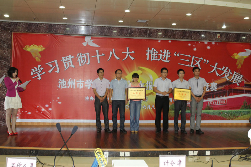 6月8日下午,集中区代表队在市委组织部、市委宣传部共同主办的“池州市学习党的十八大报告和党章知识竞赛”决赛中沉着应战、奋勇争先,荣获竞赛二等奖。