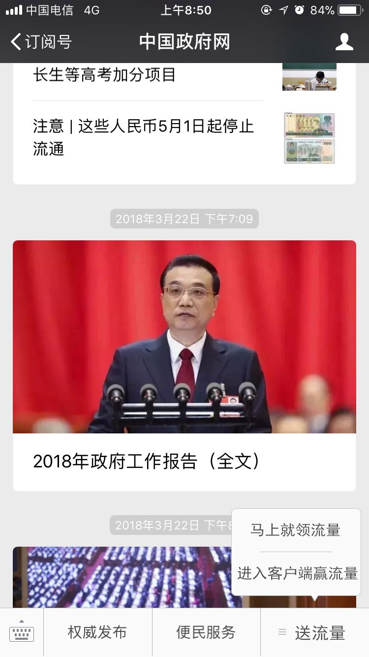 第二步:点击“中国政府网”微信公众号菜单栏“有奖答题”——“进入客户端赢流量”,下载国务院客户端。