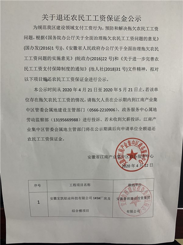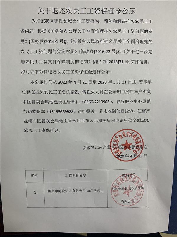关于退还宏凯铝业、海能铝业农民工工资保证金公示