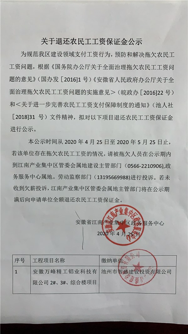 关于退还宏凯铝业、海能铝业农民工工资保证金公示