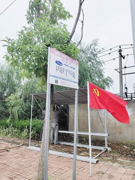 图为中建材飞渡航天科技有限公司党支部组织党员在黄山北路为公交站牌制作爱心候车棚。