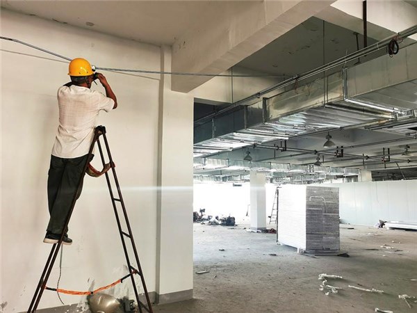 9月18日,位于集中区科技孵化园的金泰手机配件生产项目一期车间装修现场,工人在进行消防电线安装。随后将很快进行设备安装调试。