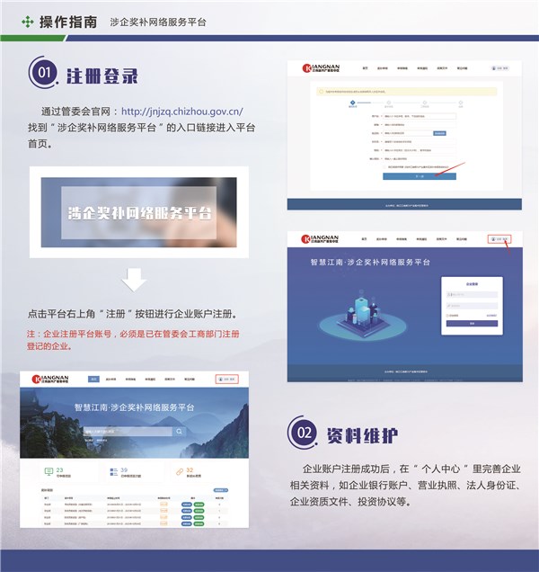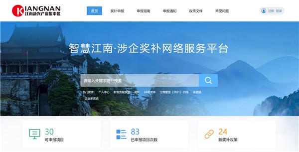 打开皖江江南新兴产业集中区管委会官方网站,找到“涉企奖补网络服务平台”入口,或打开http://jnjzq.chizhou.gov.cn/sqfwpt/网址,即可进入平台首页。