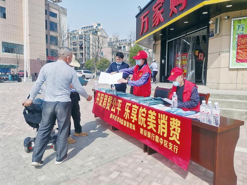 3月15日,集中区市场监管局、建设银行集中区支行的工作人员组成志愿者服务队,赴区政务服务大厅、观港花园小区、园区超市等地,向群众宣传消费维权和防范金融诈骗有关知识。