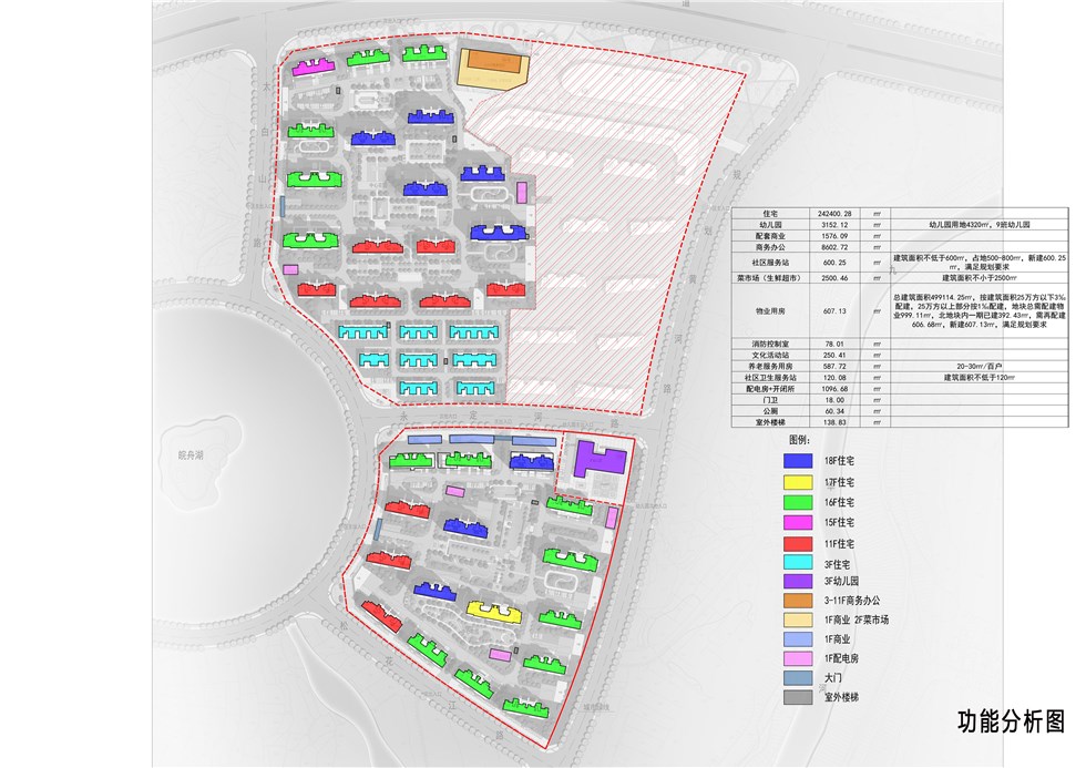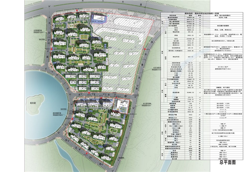 方案项目规划总建筑面积约499114.25㎡,计容建筑面积约387657.63㎡,其中住宅面积约316973.51㎡,商业面积约50426.71㎡,商务办公面积约8602.72㎡,幼儿园用地面积4320㎡,计容面积3152.12㎡,配建菜市场面积2500.46㎡,配建社居用房面积1618.8㎡(包括文化活动站、卫生服务站、社区服务站、老年活动用房、公共厕所),其他面积3383.75(包括消控室、配电房及开闭所、门卫、室外楼梯、其他等);配建物业管理用房建筑面积999.56㎡;容积率2.0,绿地率35.01%,建筑密度23%。配建机动车停车位3189个,其中地面356个,地下2833个(代建一期机动车位353辆车),非机动车位4936辆。