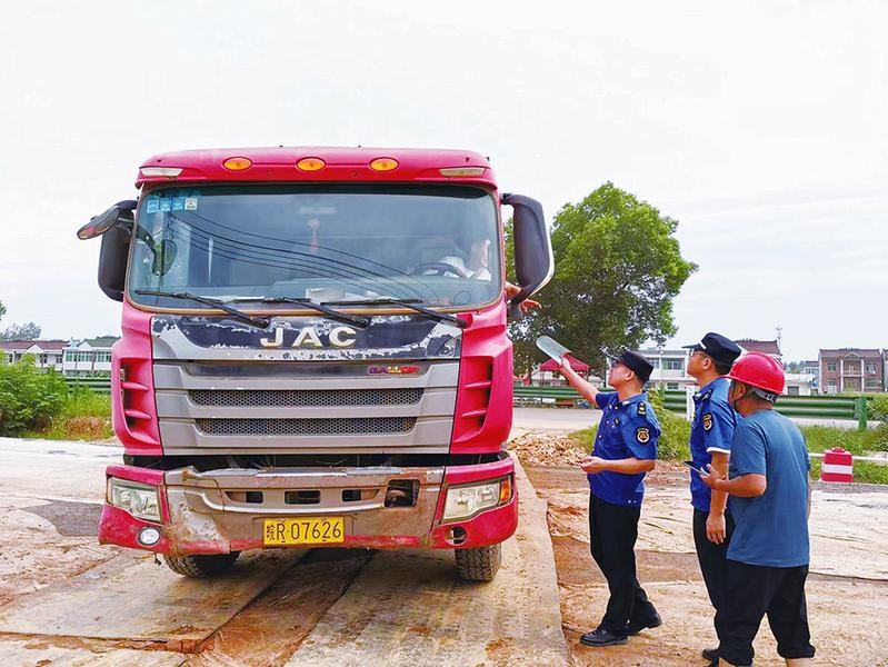 执法队员检查渣土运输车辆准运证及车辆密闭等情况