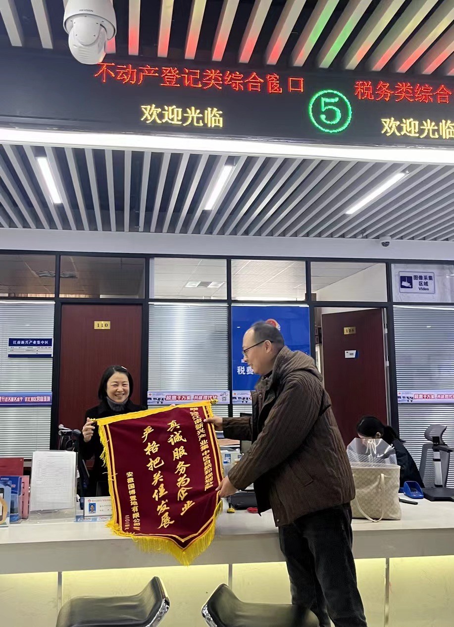 1月30日,园区企业安徽国博置地有限公司代表、池州市政协委员徐昱向集中区自然资源和规划分局赠送了一面印有“真诚服务为企业 严格把关促发展”的锦旗,对集中区自然资源和规划分局长期以来的高效服务和热情帮扶表示衷心感谢。