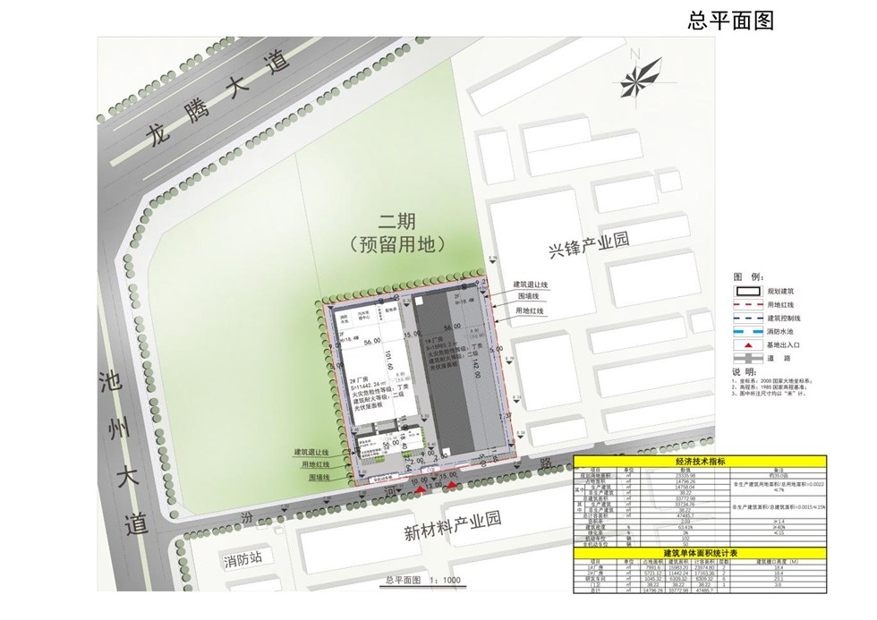 规划布置一栋研发车间,两栋生产车间,其中研发车间(六层)建筑面积6309.32平方米,1#厂房(两层)建筑面积15983.2平方米,2#厂房(两层)建筑面积11442.24平方米,总建筑面积33786平方米,总计容面积47498.72平方米,容积率为2.04,建筑密度63.46%,绿地率3%。