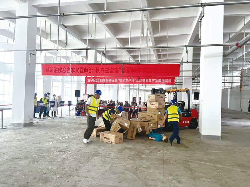 日前,集中区组织开展特种设备(叉车)应急救援演练,现场模拟叉车驾驶员由于装卸高度超高阻挡视线,致使其他人员在步行经过事发地时被压倒受伤后的应急救援全过程,进一步强化了全区特种设备安全突发事件的应急处置能力,增强了应急救援的针对性、及时性和有效性。图为演练现场。