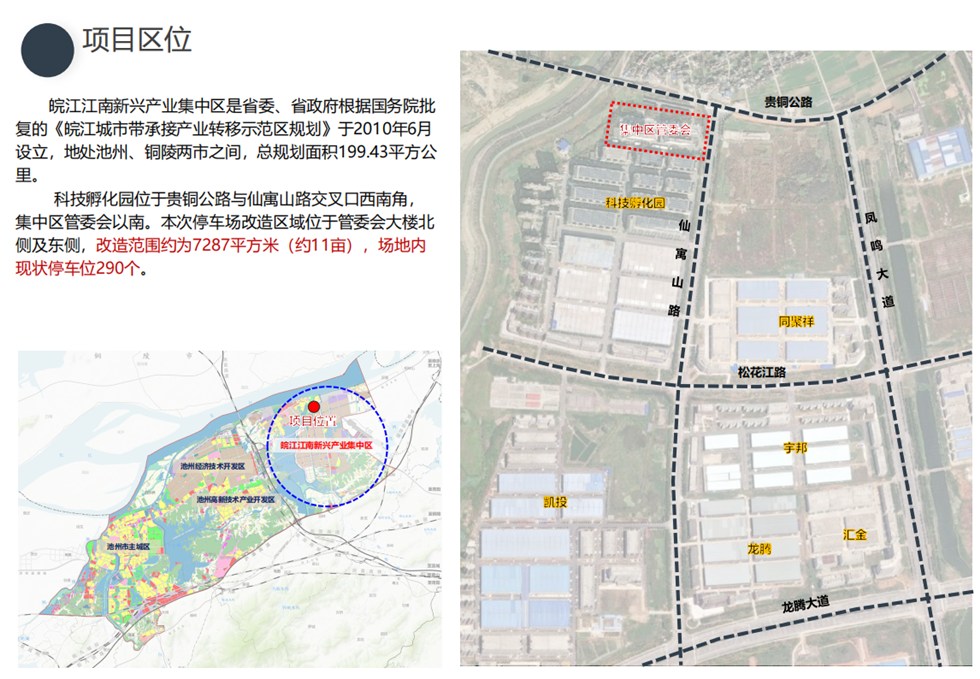 皖江江南新兴产业集中区科技孵化园Z1Z2号楼停车场项目位于管委会大楼北侧及东侧,改造范围约为7287平方米(约11亩),改造前停车位共290个,改造后停车位共372个,本次改造新增停车位82个。
