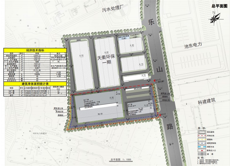 方案主要内容:规划布置两栋厂房,其中5#厂房(单层)建筑面积5746.56平方米,6#仓库(单层)建筑面积1490.56平方米。总建筑面积7237.12平方米,总计容面积21711.34平方米,容积率为1.61,建筑密度53.83%,绿地率4%。