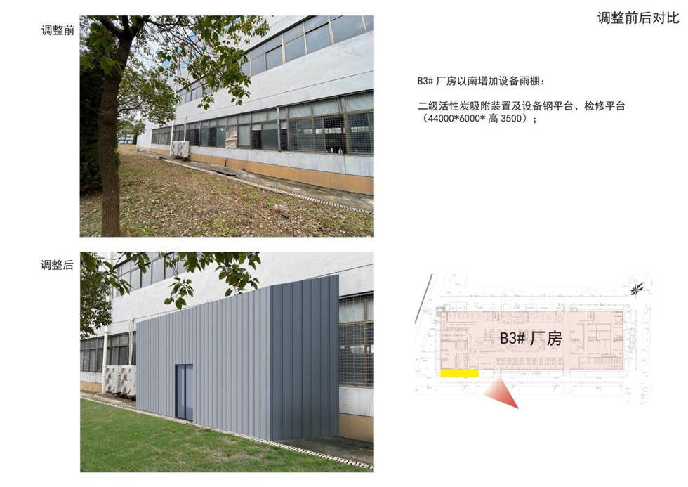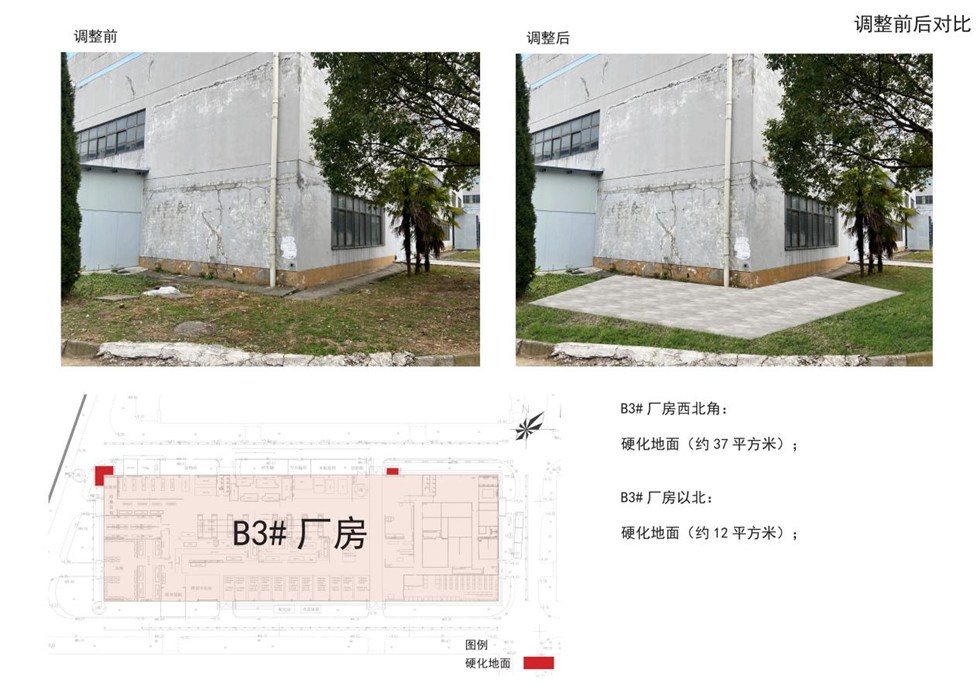 凯投工业园B3#厂房以南增设设备雨棚(长44米、宽6米、高度3.5米);凯投工业园B3#厂房以北及西北角各硬化局部地面,指标无变化。