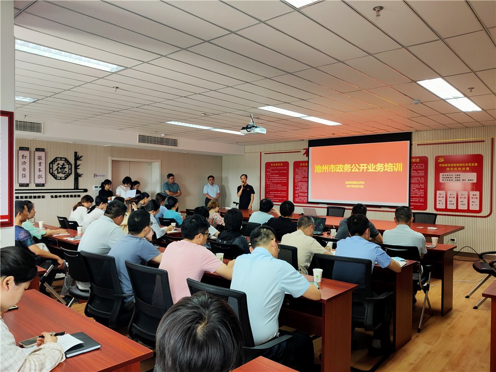 为继续做好《政府信息公开条例》贯彻落实,更好推动2021年度政务公开各项工作落实,结合2021年1-5月全市政务公开第三方测评问题整改,6月24日下午,市政务公开办在市数据资源管理局六楼会议室对全市政务公开业务人员开展培训,各县、区人民政府,江南新兴产业集中区、九华山风景区、开发区管委会以及市政府各部门、各直属机构共43名政务公开负责人和工作人员参加培训。