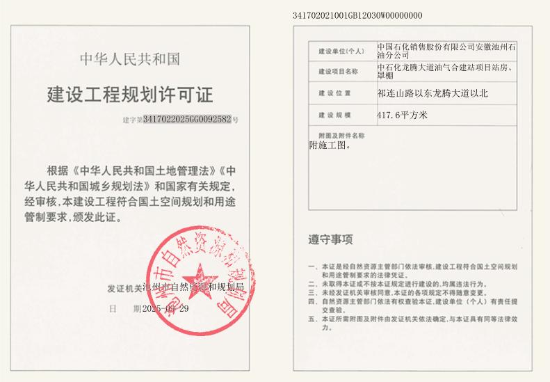 中石化龙腾大道油气合建站项目站房、罩棚《建设工程规划许可证》批后公布