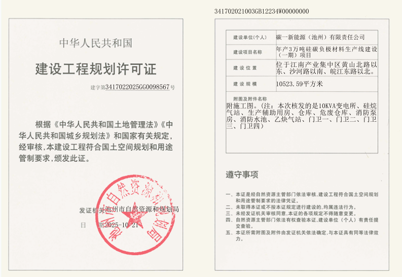 年产3万吨硅碳负极材料生产线建设(一期)项目《建设工程规划许可证》批后公布