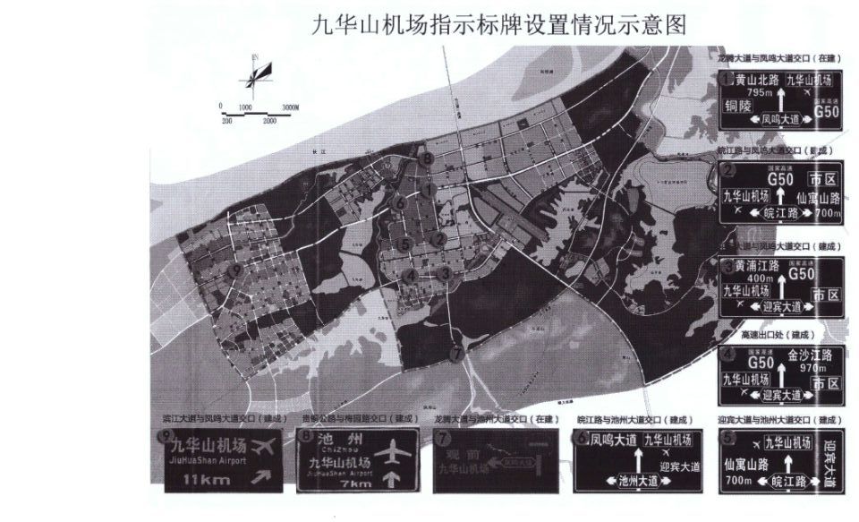 根据江南产业集中区起步区规划,近期建设的连接九华山机场的主要道路有2条,分别是迎宾大道、皖江路,目前,迎宾大道(凤鸣大道-机场)段正在建设中,皖江路是连接机场的唯一道路。为此,我区围绕九华山机场规划建设了9个指向标志,已建成7个,在建2个(详见附图)。