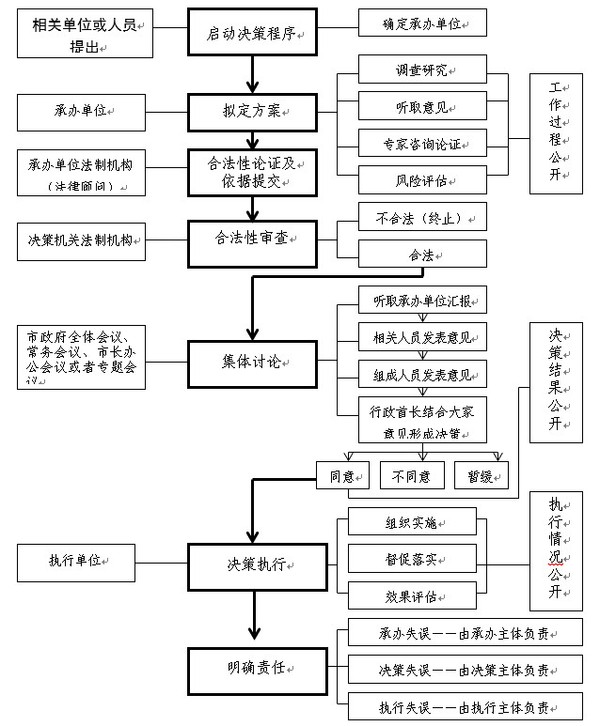 第六条 决策承办单位和承办科室对决策依据的真实性、决策建议的合法性和决策程序的合规性负责,承办单位主要负责人、分管负责人和承办科室负责人、具体工作人员,对决策和决策执行承担直接责任。