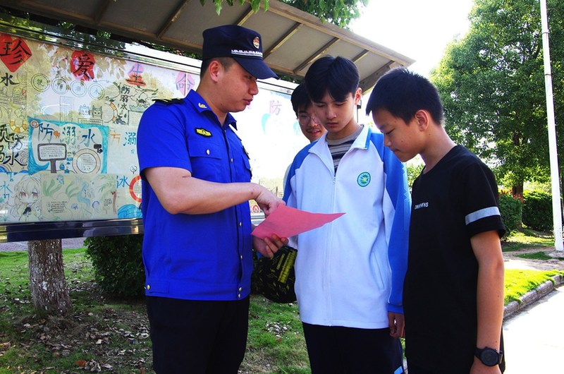 暑期将至,集中区组织人员对辖区内各重点水域进行不间断巡查,并及时更新防溺水救生器材,还深入辖区中小学、企业、商铺进行防溺水宣传,以提升群众安全防范意识。图为工作人员在江南中学宣传防溺水知识。